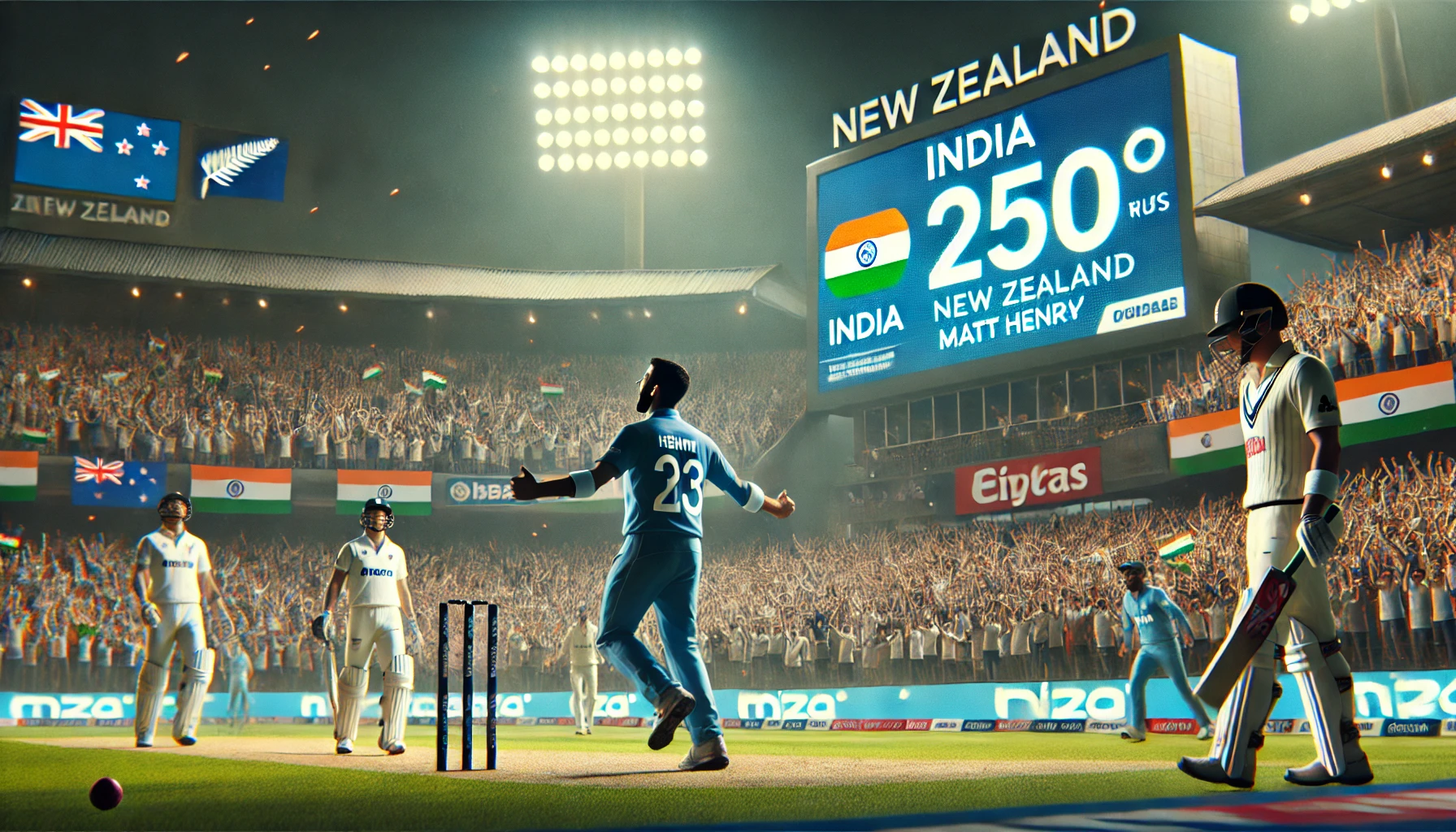 The much-anticipated clash between India and New Zealand in the Champions Trophy 2025 turned out to be an exciting contest as India set a target of 250 runs after a strong bowling display by the Kiwis. The match, held at [Venue], saw an intense battle between bat and ball, with New Zealand pacer Matt Henry stealing the show with a sensational five-wicket haul.